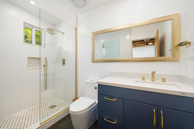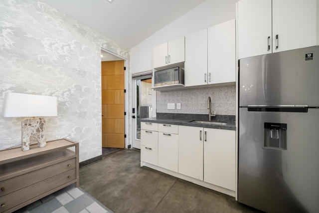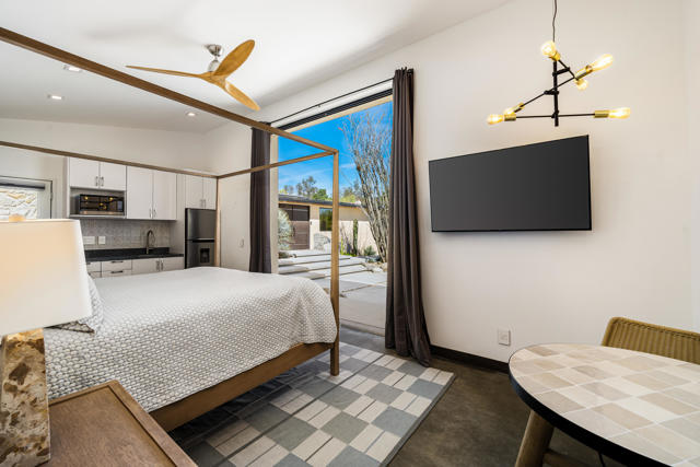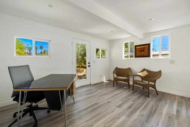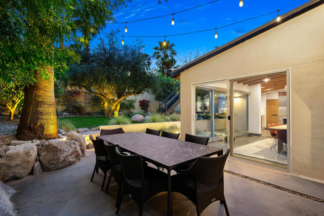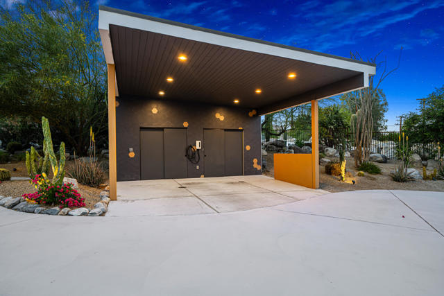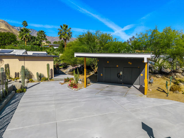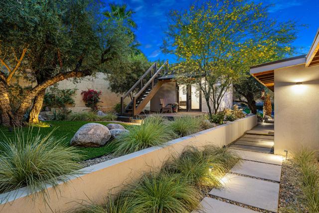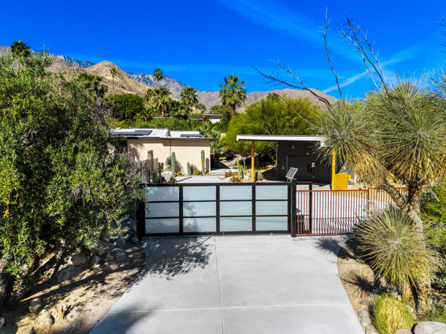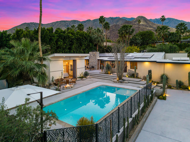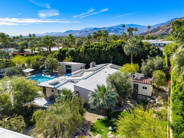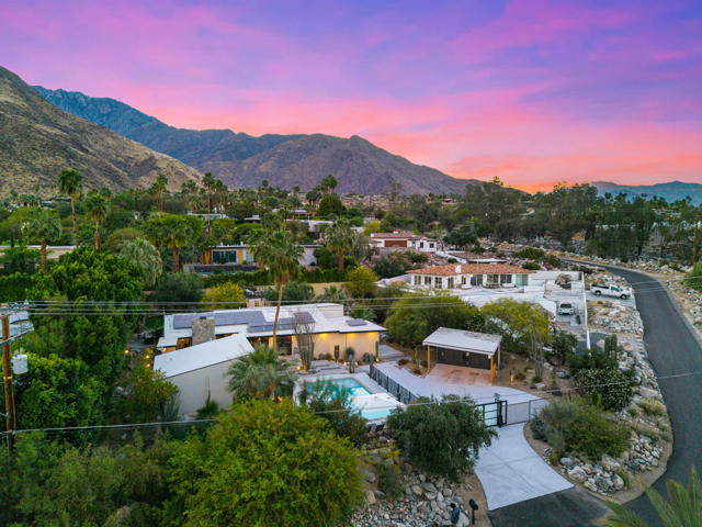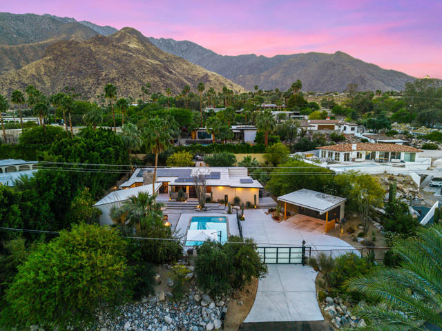 Reimagined architectural residence in the coveted Little Tuscany neighborhood of Palm Springs, offering over 3,200 sq ft of refined desert living on nearly a half-acre. Thoughtfully redesigned to balance modern aesthetics with comfort and functionality, the property presents a rare combination of privacy, scale, and flexibility.A detached guest house with soaring ceilings, Fleetwood pocket doors, custom closets, and a private bath creates an ideal retreat for guests or extended stays. The main residence unfolds into an open-concept living space anchored by a fully updated kitchen with high-end appliances and a generous center island, seamlessly connecting to the dining and living areas with a gas fireplace and built-in wine bar. Polished concrete floors throughout enhance the home's clean architectural lines and desert-modern appeal.All bedrooms offer en-suite baths and custom closets, while the primary suite serves as a private retreat with a spa-inspired bath featuring a soaking tub, dual vanities, and elevated finishes.A separate structure on the west side of the property offers versatility as a home office, gym, or studio, complemented by a rooftop deck designed for stargazing and panoramic mountain views.Outdoor living is central to the experience, with an elevated pool and tanning shelf, updated decking, firepit, hot tub, and outdoor kitchen with BBQ. The grounds have been extensively redesigned by Desert Landscape Design with over $250,000 invested, creating a cohesive and elevated desert landscape.Significant system upgrades include replaced copper plumbing, re-foamed roof, reactivated solar system, newer pool equipment, EV charging station, new windows, motorized window treatments, updated lighting, and more. Previously owned by composer Ernst Krenek, adding a layer of cultural and architectural significance.