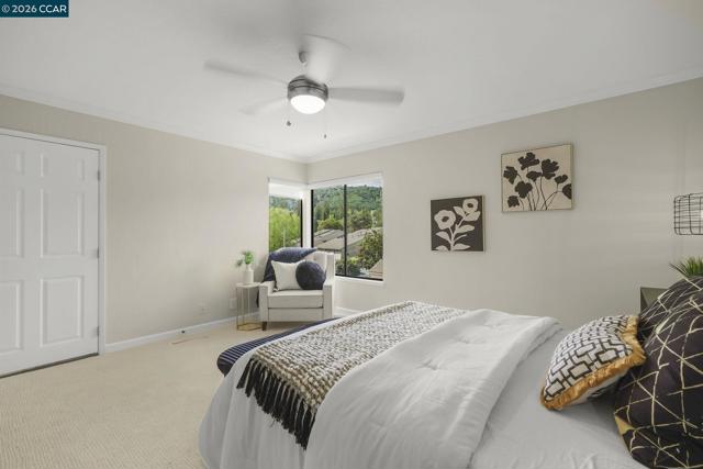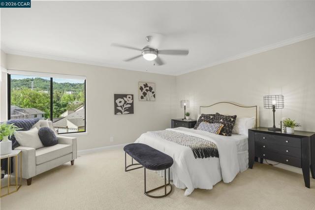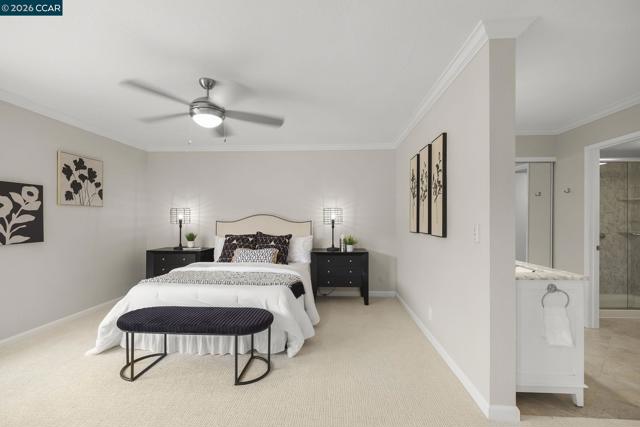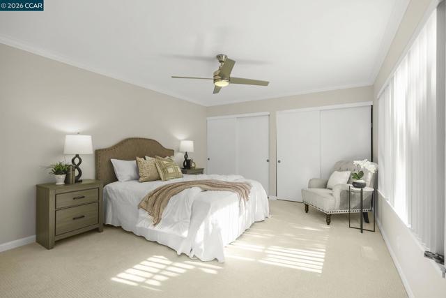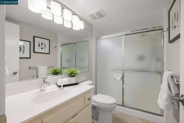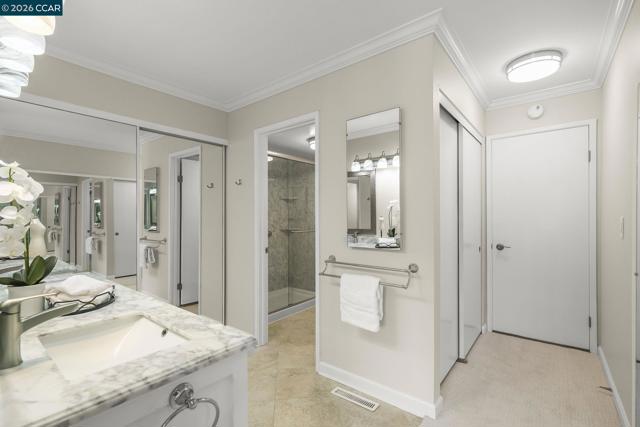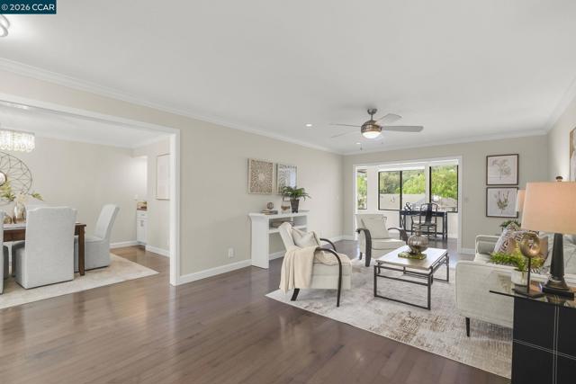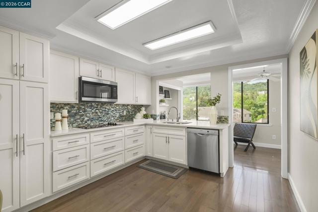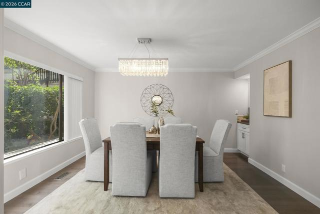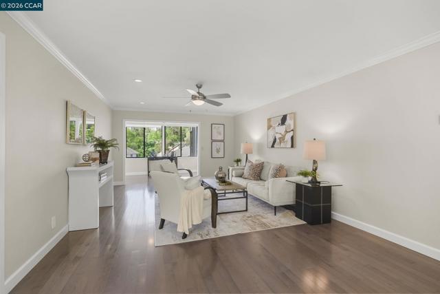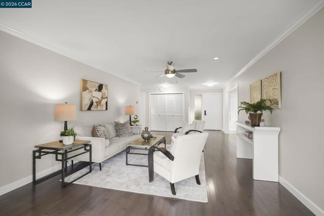 Extended Sierra • 1,620 sq. ft. Beautiful views of rolling hills! This spacious condo offers an open layout with exceptional natural light. Fresh interior paint and a remodeled kitchen feature newer stainless steel appliances, extra storage, pull-out cabinets, oversized soft-close drawers, and a unique designer backsplash. The large living area is ideal for gatherings, and the sit-down kitchen nook can also function as a home office with serene hill views. A separate oversized formal dining area sits just off the kitchen. The home includes rich engineered hardwood floors in the main living areas and plush carpet in both generously sized bedrooms. The laundry room provides a washer, dryer, and abundant shelving. Enjoy views from the kitchen, living room, and primary bedroom. Entry 4.
