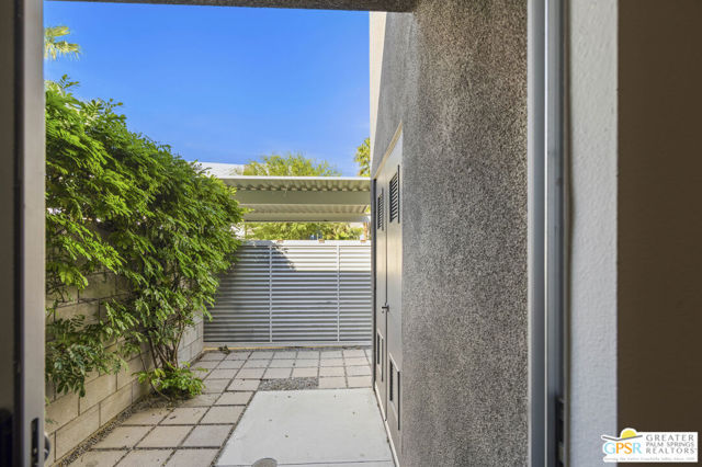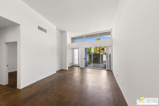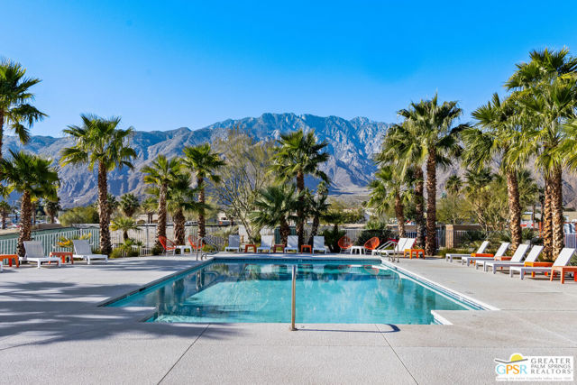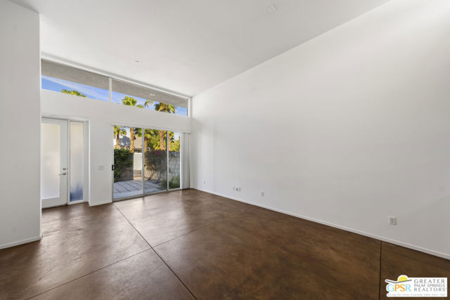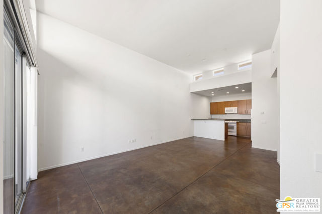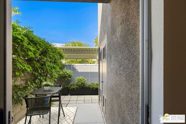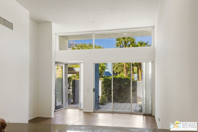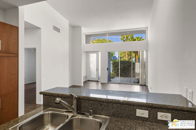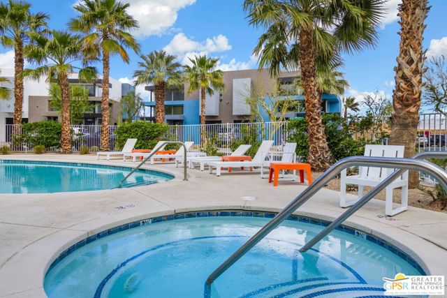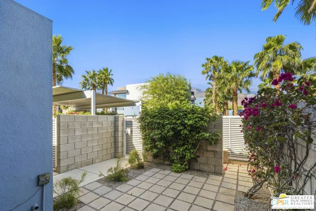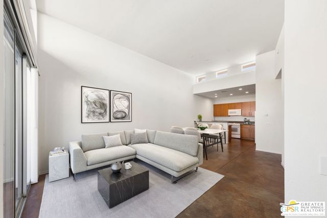 Welcome to Palermo, one of Palm Springs' most sought-after gated communities, where modern design meets effortless desert living. This beautifully appointed one-bedroom, one-bath condo offers 833 sq ft of open-concept space with soaring ceilings and abundant natural light, creating a bright, airy feel throughout at an unbeatable price under $300k! The living and dining areas flow seamlessly into the kitchen, offering a functional layout ideal for everyday living and entertaining. Stained concrete floors add a sleek, contemporary edge, while the volume ceilings enhance the sense of scale rarely found in a one-bedroom home. The spacious bedroom provides a peaceful retreat, featuring a large walk-in closet and high ceilings. The large bathroom features a huge walk-in spa shower, as well as a large linen and storage closet. Enjoy true indoor-outdoor living with two private patios, perfect for morning coffee or evening relaxation with peek-a-boo mountain views. Recent updates include newer interior paint, water heater, microwave, dishwasher plus washer and dryer. Additional highlights include dedicated parking right outside your door and generous storage throughout, uncommon for a one-bedroom unit. Plus you own the land - no lease! Palermo residents enjoy resort-style amenities including multiple pools and spas, fitness center, clubhouse, and beautifully maintained grounds, all just minutes from downtown Palm Springs. Perfect for in-town living or the savvy investor, this unit is ready to go!