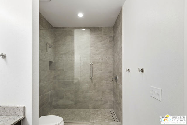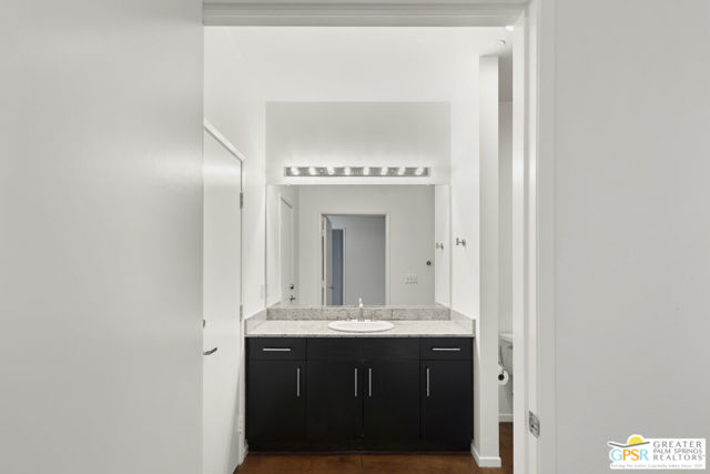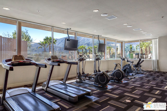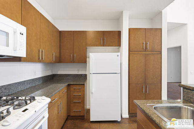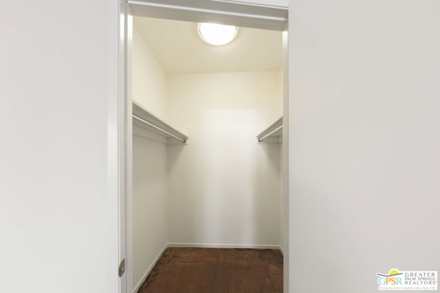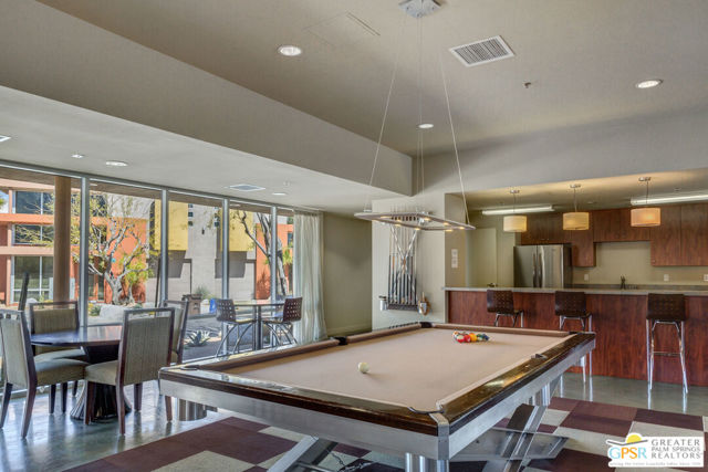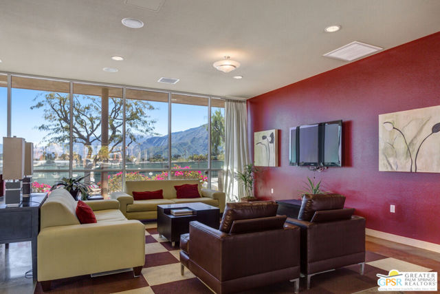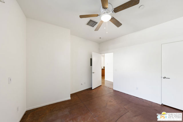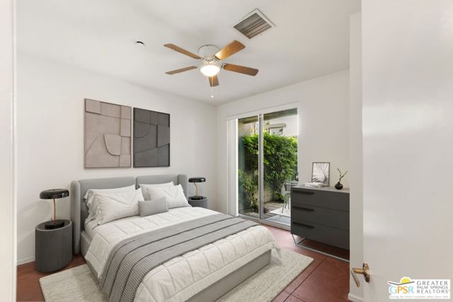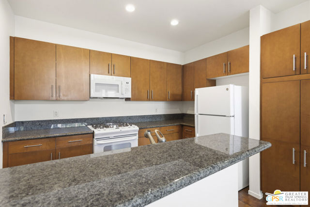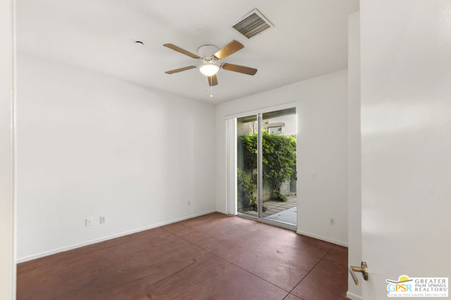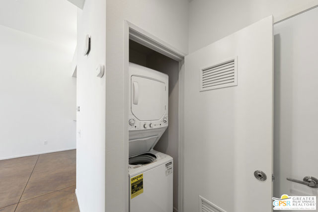 Welcome to Palermo, one of Palm Springs' most sought-after gated communities, where modern design meets effortless desert living. This beautifully appointed one-bedroom, one-bath condo offers 833 sq ft of open-concept space with soaring ceilings and abundant natural light, creating a bright, airy feel throughout at an unbeatable price under $300k! The living and dining areas flow seamlessly into the kitchen, offering a functional layout ideal for everyday living and entertaining. Stained concrete floors add a sleek, contemporary edge, while the volume ceilings enhance the sense of scale rarely found in a one-bedroom home. The spacious bedroom provides a peaceful retreat, featuring a large walk-in closet and high ceilings. The large bathroom features a huge walk-in spa shower, as well as a large linen and storage closet. Enjoy true indoor-outdoor living with two private patios, perfect for morning coffee or evening relaxation with peek-a-boo mountain views. Recent updates include newer interior paint, water heater, microwave, dishwasher plus washer and dryer. Additional highlights include dedicated parking right outside your door and generous storage throughout, uncommon for a one-bedroom unit. Plus you own the land - no lease! Palermo residents enjoy resort-style amenities including multiple pools and spas, fitness center, clubhouse, and beautifully maintained grounds, all just minutes from downtown Palm Springs. Perfect for in-town living or the savvy investor, this unit is ready to go!