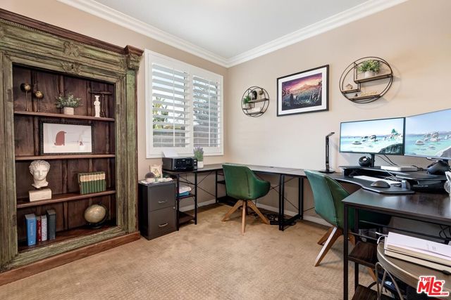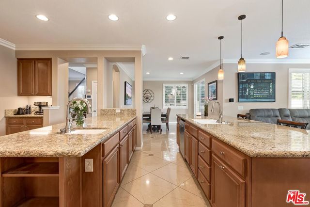 Beautiful home with amazing pool nestled within the prestigious community of Tesoro Del Valle. This elegant five bedroom, four bathroom welcomes you with a grand entryway, refined neutral palette, crown molding throughout, and abundant natural and recessed lighting that creates an airy ambiance. The warm, open floor plan features a spacious living room with fireplace, an open dining area, plantation shutters, and a convenient downstairs bedroom with full bath ideal for an office or guests. The chef's kitchen is both stunning and functional, showcasing stainless steel appliances, custom marble flooring, granite countertops with two generous center islands, a large pantry, and rich maple wood cabinetry. Upstairs, a versatile loft/study area anchors four additional bedrooms. The expansive primary suite is a true retreat, offering an oversized jetted soaking tub, dual vanities with separate sink areas, and a large walk-in closet. Designed for entertaining, the backyard oasis boasts a sparkling pool, spa, and a spacious patio with gazebo seating. Additional highlights include two newer dual AC system for year-round comfort, and an oversized garage with room for storage/gym. Tesoro Del Valle residents enjoy resort-style amenities including a clubhouse, pool and spa, lake, parks, playgrounds, scenic paseos, walking trails, and a fitness center, all conveniently located near shopping, dining, and award-winning schools.